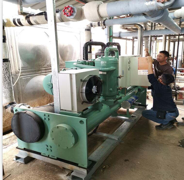 冷水機(jī)組包括很多種,而螺桿式冷水機(jī)則為其中較為重要的一種,因其關(guān)鍵部件-壓縮機(jī)采用螺桿式故名螺桿式冷水機(jī)。機(jī)組由蒸發(fā)器出來的狀態(tài)為氣體的冷媒;經(jīng)壓縮機(jī)絕熱壓縮以后,變成高溫高壓狀態(tài)。被壓縮后的氣體冷媒,在冷凝器中,等壓冷卻冷凝,經(jīng)冷凝后變化成液態(tài)冷媒,再經(jīng)節(jié)流閥膨脹到低壓,變成氣液混合物。其中低溫低壓下的液態(tài)冷媒,在蒸發(fā)器中吸收被冷物質(zhì)的熱量,重新變成氣態(tài)冷媒。氣態(tài)冷媒經(jīng)管道重新進(jìn)入壓縮機(jī),開始新的循環(huán)。這就是冷凍循環(huán)的四個(gè)過程,也是螺桿式冷水機(jī)的主要工作原理。